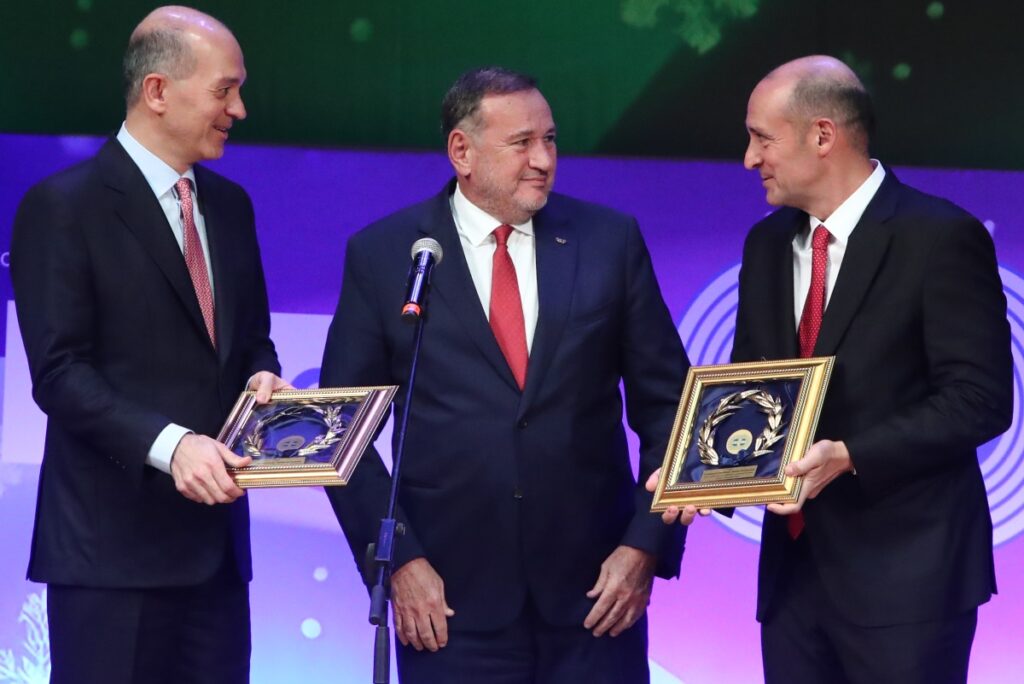 Οι Παναγιώτης και Γιώργος Αγγελόπουλος έδωσαν το «παρών» στο Δημοτικό Θέατρο Πειραιά, όπου βραβεύτηκαν από τον ΠΣΑΤ για τη συνολική προσφορά τους στον Ολυμπιακό, σε μια ιδιαίτερα συμβολική χρονιά, καθώς ο σύλλογος συμπληρώνει 100 χρόνια ιστορίας.