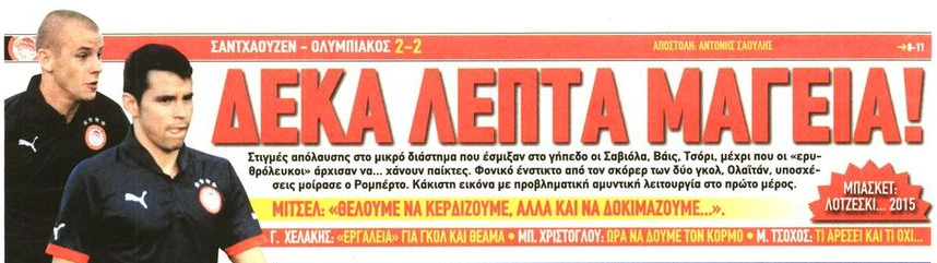 ”Στιγμές απόλαυσης στο μικρό διάστημα που έσμιξαν στο γήπεδο οι Σαβιόλα, Βάις, Τσόρι… Φονικό ένστικτο από τον σκόρερ των δύο γκολ, Ολαϊτάν, μοίρασε υποσχέσεις ο Ρομπέρτο”. Όλα τα προαναφερθέντα σε έναν αγώνα, όπου ο Ολυμπιακός αντιμετώπιζε την πιο αδύναμη ομάδα της Bundesliga 2, η οποία μάλιστα δεν έχει καταφέρει ακόμα να σκοράρει στο πρωτάθλημα! Παρόλα αυτά, βρήκε τον τρόπο να αποσπάσει την ισοπαλία και να σημειώσει και δύο γκολ εις βάρος των Πειραιωτών.