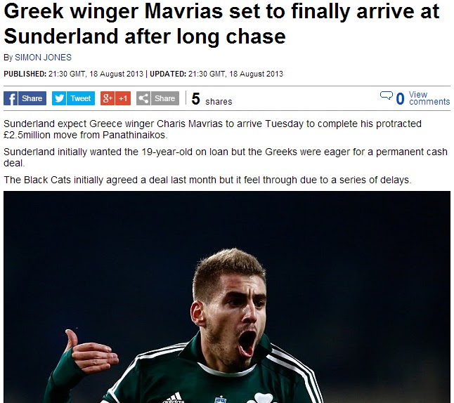 Εκεί που όλα έδειχναν πως η Σάντερλαντ θα κάνει πίσω στην περίπτωση του Χάρη Μαυρία, νέο Αγγλικό δημοσίευμα της “daily mail” κάνει λόγο για οριστική συμφωνία μεταξύ των δύο πλευρών! Μάλιστα, οι Άγγλοι αναφέρουν και το ποσό της συμφωνίας, το οποίο αγγίζει τα 3 εκατομμύρια ευρώ. Επίσης τονίζεται πως οι “μαυρόγατες” ζήτησαν τον παίχτη αρχικά ως δανεικό, αλλά ο Παναθηναϊκός δεν συζήτησε κάτι τέτοιο. Τέλος το δημοσίευμα υποστηρίζει πως ο 19χρονος άσσος θα μεταβεί στο νησί μέχρι την Τρίτη (20/8) για τις υπογραφές.