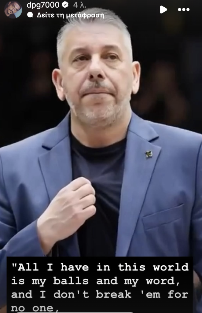 Ο διοικητικός ηγέτης του «Τριφυλλιού» ανέβασε story με φωτογραφία του προπονητή του Αμαρουσίου, Ηλία Παπαθεοδώρου, συνοδεύοντάς τη με μια φράση με σαφές νόημα, σε μια χρονική στιγμή όπου οι εξελίξεις γύρω από την υπόθεση έχουν ανεβάσει κατακόρυφα την ένταση στο ελληνικό μπάσκετ.