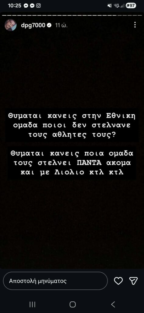 Συγκεκριμένα, ανέφερε: «Θυμάται κανείς στην Εθνική ομάδα ποιοι δεν στέλναν αθλητές τους; Θυμάται κανείς ποια ομάδα τους στέλνει ΠΑΝΤΑ ακόμα και με Λιόλιο κτλ κτλ;»