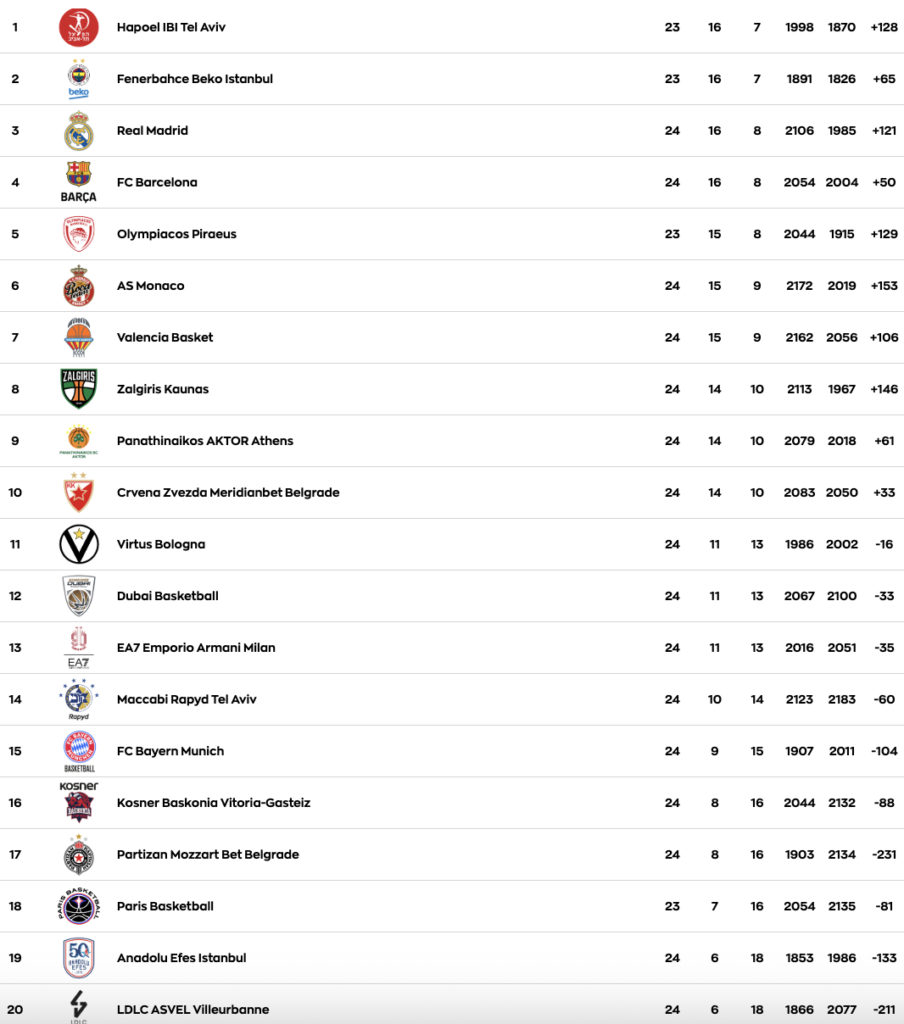 Στην κορυφή, τέσσερις ομάδες συγκατοικούν πλέον στις 16 νίκες. Η Χάποελ Τελ Αβίβ γνώρισε ήττα-σοκ από την Παρτίζαν στην παράταση, γεγονός που επέτρεψε στη Φενέρμπαχτσε να τη φτάσει, μετά την άνετη νίκη της επί της Μπασκόνια. Αμφότερες έχουν και από ένα παιχνίδι λιγότερο, οι Ισραηλινοί εντός με την Παρί και οι Τούρκοι εκτός με τον Ολυμπιακό, κάτι που κρατά ανοιχτά όλα τα σενάρια για την πρωτιά.