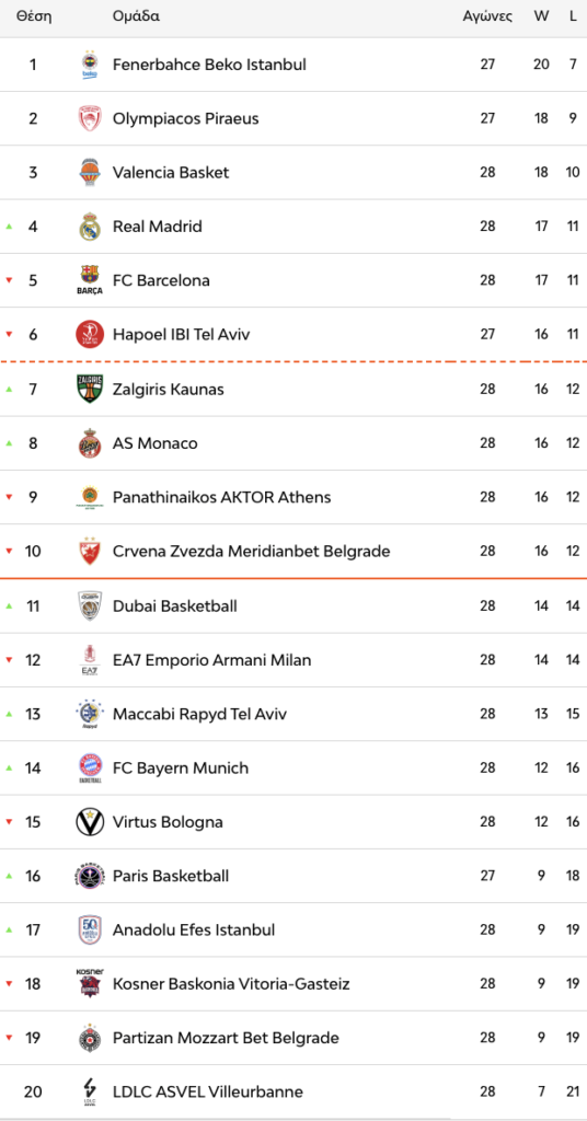 Έτσι διαμορφώθηκε η βαθμολογία στην Ευρωλίγκα, μετά την ολοκλήρωση της αναμέτρησης για την 28η αγωνιστική ανάμεσα στον Παναθηναϊκό και την Φενερμπαχτσέ.