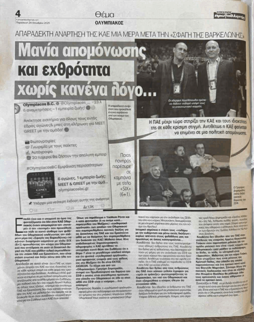 Το δημοσίευμα που κυκλοφόρησε στον Τύπο αποκαλύπτει έναν πραγματικό εμφύλιο ανάμεσα σε ΠΑΕ και ΚΑΕ Ολυμπιακός, με εκατέρωθεν αιχμές, οργή και μια έντονη αίσθηση διάσπασης, τη στιγμή που το κλαμπ προσπαθεί να διαχειριστεί το μεγαλύτερο επικοινωνιακό φιάσκο των τελευταίων ετών.