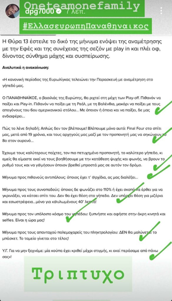 Στο story που κοινοποίησε, περιλαμβάνεται η ανακοίνωση της Θύρας 13, η οποία καλεί σε απόλυτη στήριξη της ομάδας ενόψει των κρίσιμων αναμετρήσεων που ακολουθούν, είτε πρόκειται για play-in είτε για playoffs. Οι οργανωμένοι οπαδοί δίνουν έμφαση στη νοοτροπία νικητή, τονίζοντας πως στόχος είναι η παρουσία στο Final Four και η διεκδίκηση της κορυφής.