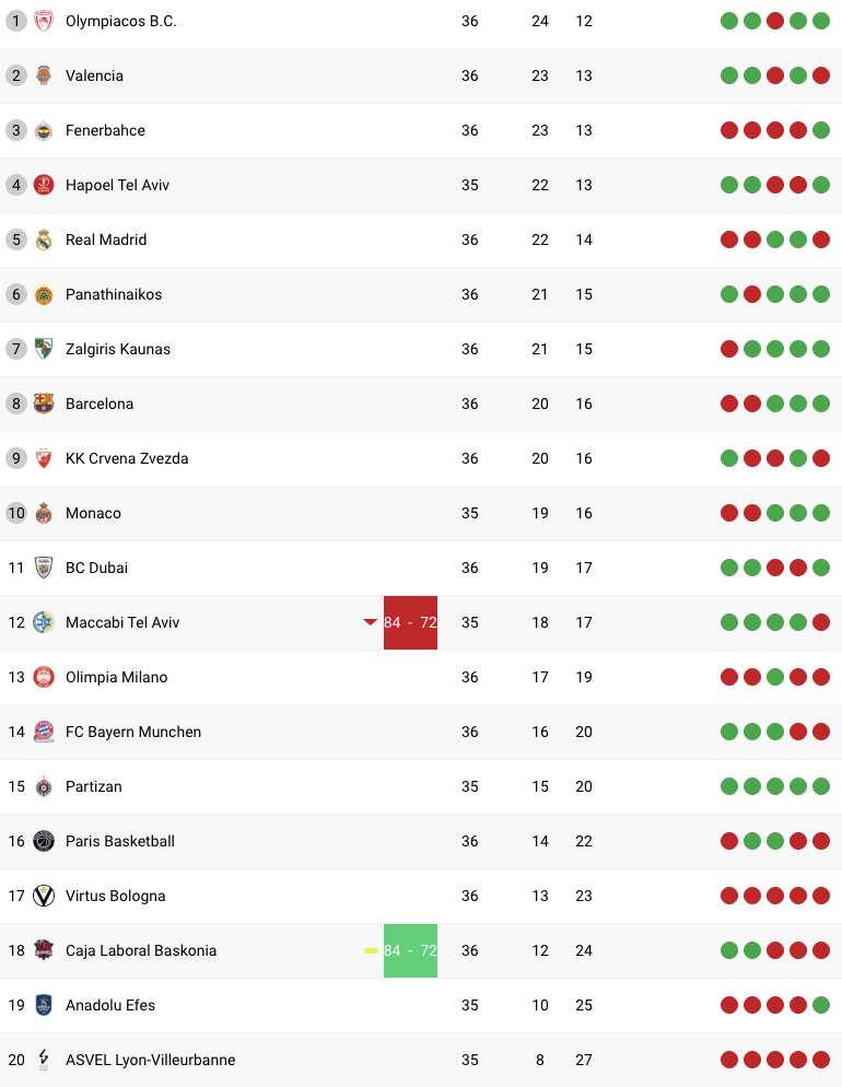 Έτσι διαμορφώθηκε η βαθμολογία στην Ευρωλίγκα, μετά την ολοκλήρωση της αναμέτρησης για την 36η αγωνιστική ανάμεσα στον Παναθηναϊκό και την Μπαρτσελόνα.