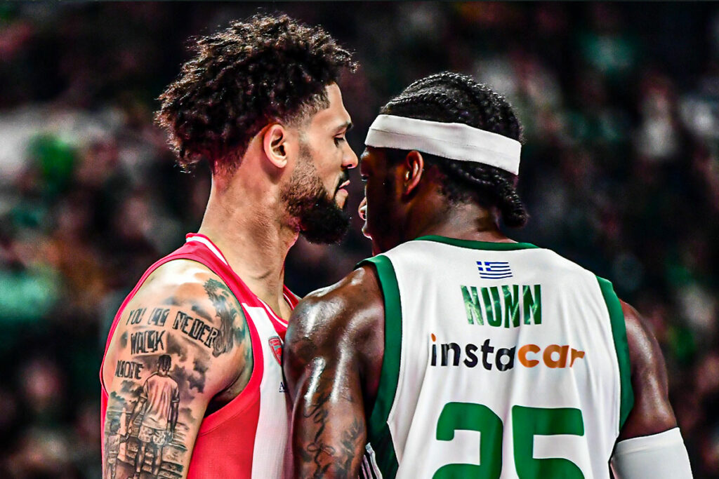 Οι δύο παίκτες ήρθαν πρόσωπο με πρόσωπο, με την κατάσταση να ξεφεύγει και να οδηγεί σε σύρραξη, καθώς κόλλησαν κεφάλι με κεφάλι μέσα στο παρκέ. Από την ένταση της στιγμής, ο γκαρντ των «ερυθρόλευκων» βρέθηκε με σκισμένη φανέλα, ενώ χρειάστηκε η παρέμβαση των ψυχραιμότερων για να αποφευχθούν τα χειρότερα.