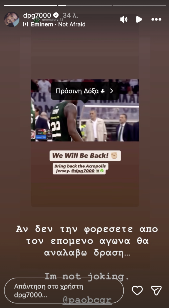 Ο ισχυρός άνδρας των «πρασίνων» αναδημοσίευσε ανάρτηση φιλάθλου που ανέφερε «Bring back the Acropolis jersey» και στη συνέχεια έγραψε χαρακτηριστικά: «Αν δεν την φορέσετε από τον επόμενο αγώνα θα αναλάβω δράση… I’m not joking», κάνοντας tag τον επίσημο λογαριασμό της ομάδας.