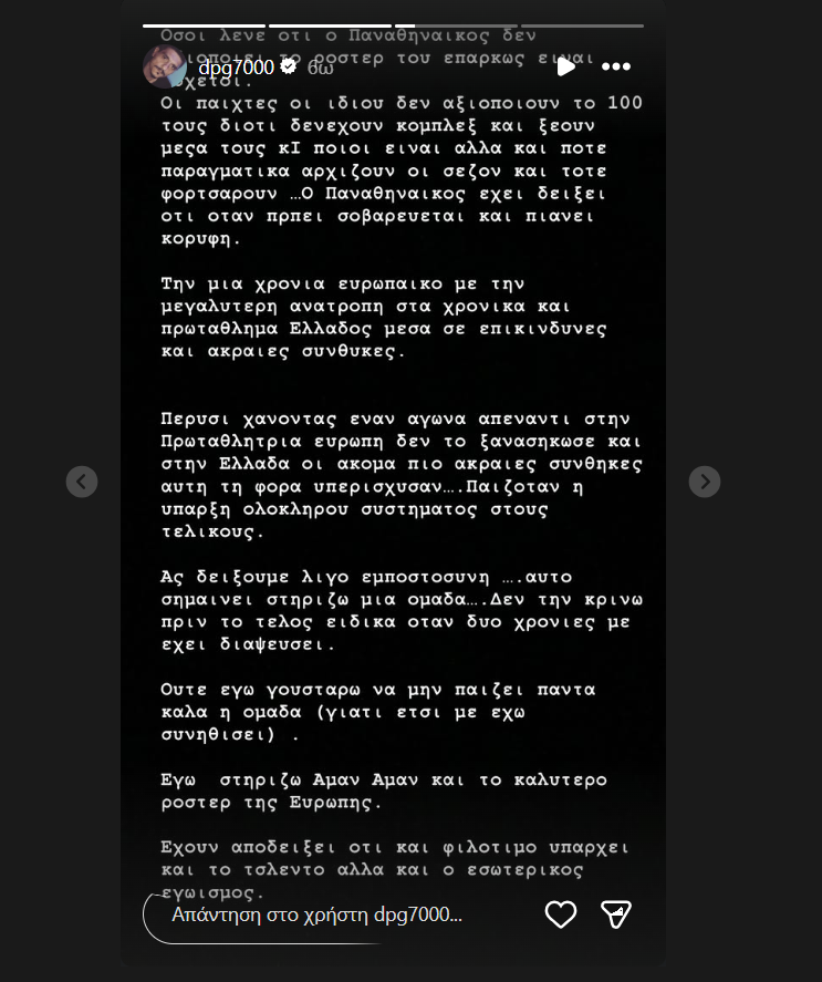 Συγκεκριμένα, μέσω story στο Instagram τα ξημερώματα της Πέμπτης (8/1), ο ισχυρός άνδρας του «Τριφυλλιού» στάθηκε στην ανάγκη για ενότητα και υπομονή, σε μια περίοδο όπου η κριτική είναι έντονη. Όπως τόνισε, αυτό που προέχει είναι η εμπιστοσύνη στη συνολική προσπάθεια μέχρι να ολοκληρωθεί η διαδρομή.