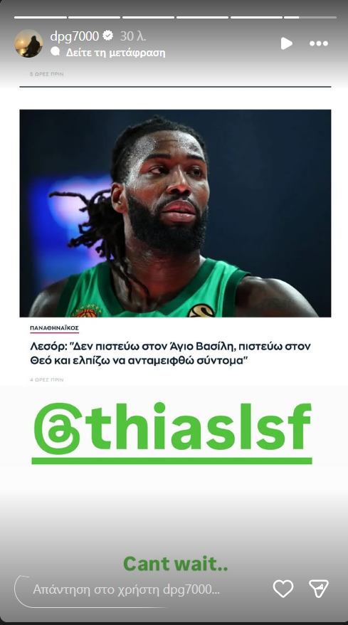 Λίγο αργότερα, ο Δημήτρης Γιαννακόπουλος επανήλθε με νέα ανάρτηση, αυτή τη φορά αφιερωμένη στον Ματίας Λεσόρ. Αφορμή στάθηκε η άκρως συναισθηματική συνέντευξη που παραχώρησε ο Γάλλος σέντερ πριν από τον αγώνα με τη Χάποελ Τελ Αβίβ, στην οποία μίλησε ανοιχτά για τη δύσκολη περίοδο που περνά και αποκάλυψε πως προσεύχεται καθημερινά, με μοναδικό στόχο να επιστρέψει υγιής και έτοιμος για να βοηθήσει ξανά τον Παναθηναϊκό.