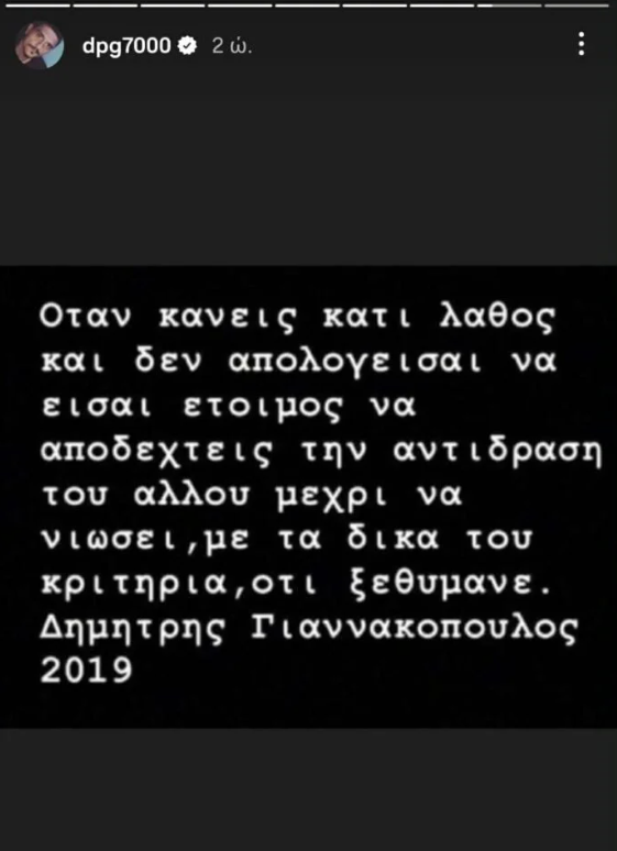 «Όταν κάνεις κάτι λάθος και δεν απολογείσαι, να είσαι έτοιμος να αποδεχτείς την αντίδραση του άλλου, μέχρι να νιώσει με τα δικά του κριτήρια, ότι ξεθύμανε. Δημήτρης Γιαννακόπουλος 2019»