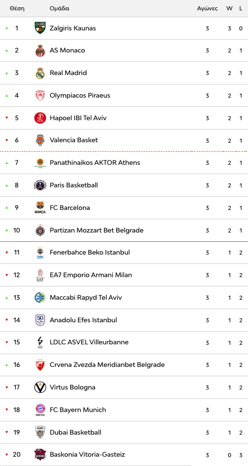 Στην κορυφή της βαθμολογίας παραμένει η Ζάλγκιρις Κάουνας με 3/3 νίκες, έπειτα από το «διπλό» στο Μόναχο επί της Μπάγερν (70-98), δείχνοντας ότι αποτελεί μία από τις ευχάριστες εκπλήξεις του φετινού ξεκινήματος.