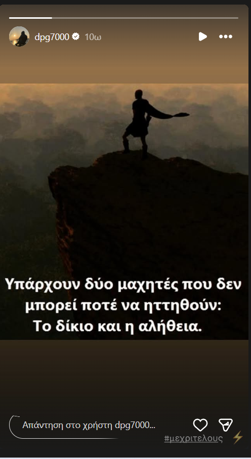 Η ανάρτηση αναφερόταν σε δύο είδη μαχητών που δεν μπορούν να ηττηθούν ποτέ, εκείνους που μάχονται για το δίκαιο και την αλήθεια. Η φράση «μέχρι τέλους» που συνόδευε το story, ενίσχυσε τον αινιγματικό χαρακτήρα του μηνύματος, πυροδοτώντας συζητήσεις και ερμηνείες από τους φίλους της ομάδας και όχι μόνο.