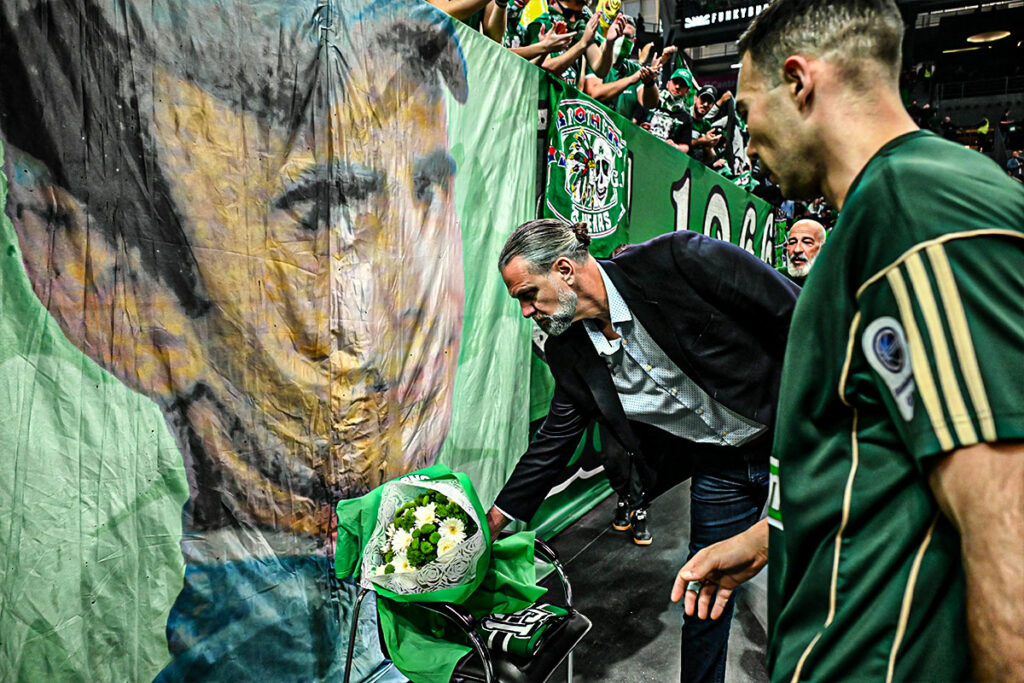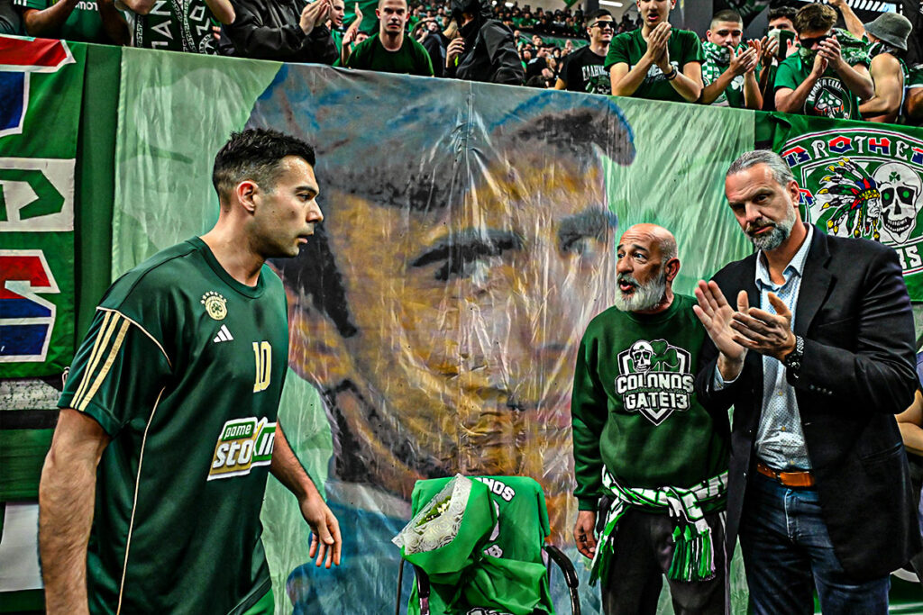 Σε μία ιδιαίτερα φορτισμένη στιγμή πριν από την έναρξη της αναμέτρησης με τον Ολυμπιακό, οι Φραγκίσκος Αλβέρτης και Κώστας Σλούκας προχώρησαν σε μία συμβολική, αλλά μεγαλειώδη κίνηση μνήμης στο ΟΑΚΑ.