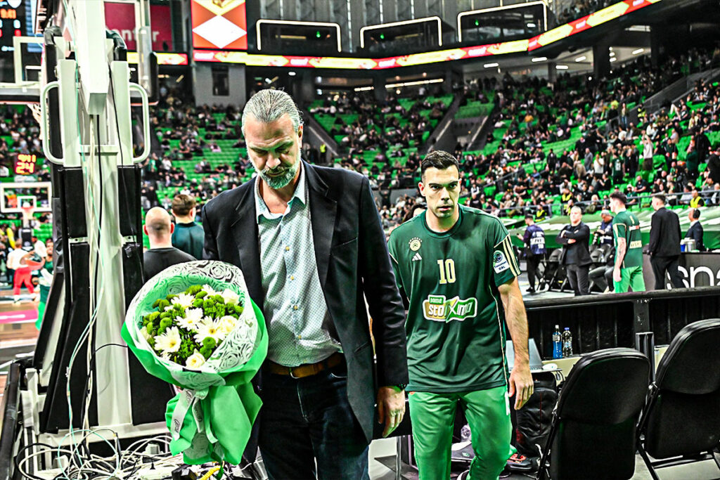 Σε μία ιδιαίτερα φορτισμένη στιγμή πριν από την έναρξη της αναμέτρησης με τον Ολυμπιακό, οι Φραγκίσκος Αλβέρτης και Κώστας Σλούκας προχώρησαν σε μία συμβολική, αλλά μεγαλειώδη κίνηση μνήμης στο ΟΑΚΑ.