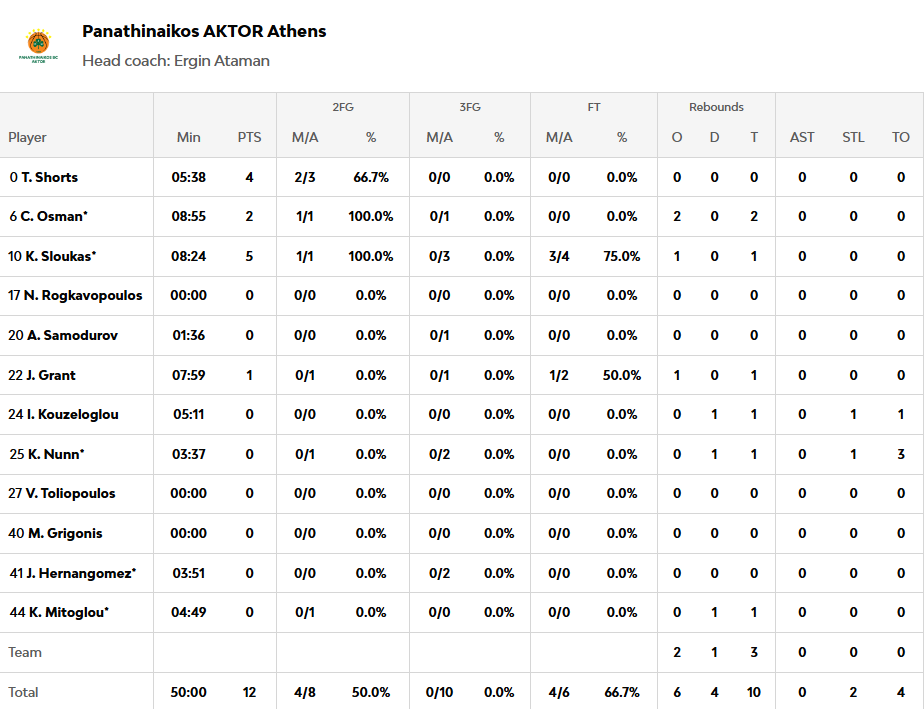 Παρά το γεγονός ότι βρήκε κάποιες λύσεις κοντά στο καλάθι (4/8 δίποντα), η έλλειψη ευστοχίας από την περιφέρεια και η απουσία ομαδικού παιχνιδιού δεν του επέτρεψαν να βρει ρυθμό απέναντι στη συμπαγή άμυνα των Σέρβων. Το πρώτο δεκάλεπτο ολοκληρώθηκε με μόλις 12 πόντους ενεργητικό, αποτυπώνοντας την αδυναμία των «πράσινων» να εκμεταλλευτούν τις επιθετικές τους επιλογές.