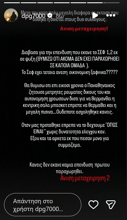 Το ΣΕΦ έχει τέτοια άνεση οικονομική ξαφνικά; Θα θυμίσω ότι επί είκοσι χρόνια ο Παναθηναϊκός ζητούσε μετρητές ρεύματος δικούς του και αυτονόμηση χρεώσεων διότι για να θερμανθεί η κεντρική σάλα μπάσκετ έπρεπε να θερμανθεί και η μεγάλη πισίνα… Ουδέποτε ασχολήθηκε κανείς.