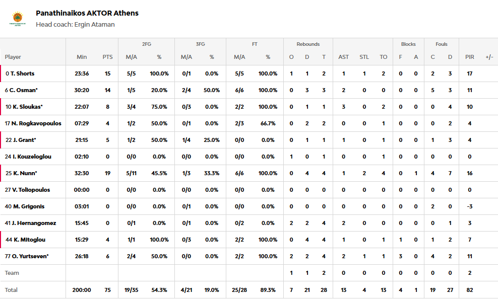 Αναλυτικά, ο Ντίνος Μήτογλου και ο Κώστας Σλούκας είχαν 0/3, ενώ οι Σόρτς, Ρογκαβόπουλος, Γκριγκόνις και Χουάντσο Ερνανγκόμεθ είχαν από 0/1. Ο Τσεντί Οσμάν ξεχώρισε με 2/4, ο Γκραντ μέτρησε 1/4 και ο Κέντρικ Ναν 1/3.