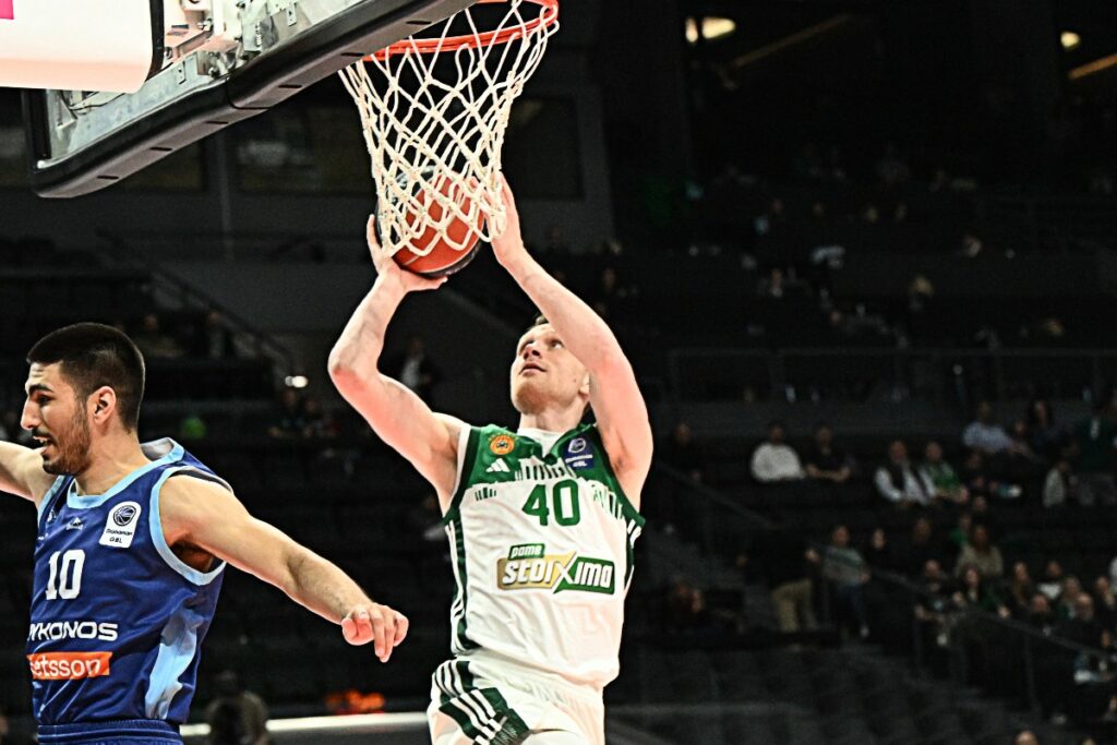 ο Παναθηναϊκός έκλεισε τις υποχρεώσεις του στην κανονική διάρκεια της GBL με μια νίκη χωρίς ιδιαίτερη πίεση απέναντι στη Μύκονο, στρέφοντας ήδη την προσοχή του στα κρίσιμα παιχνίδια της EuroLeague με τη Βαλένθια. Το ξεκίνημα της αναμέτρησης δεν ήταν ιδανικό για το «Τριφύλλι», καθώς μετά το 2-0 οι φιλοξενούμενοι βρήκαν ρυθμό και προηγήθηκαν με 2-5, εκμεταλλευόμενοι την αρχική αστοχία των «πράσινων». Σταδιακά όμως, η ομάδα του Εργκίν Αταμάν ανέβασε την ένταση, βελτίωσε την κυκλοφορία της μπάλας και ανέκτησε τον έλεγχο του αγώνα. Ο Μάριους Γκριγκόνις αποτέλεσε τον βασικό εκφραστή της επίθεσης, σκοράροντας 8 πόντους και οδηγώντας τον Παναθηναϊκό στο 25-18 του πρώτου δεκαλέπτου, σε μια περίοδο που έδειξε την ποιοτική διαφορά των δύο ομάδων.