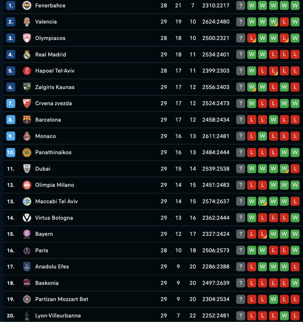 Έτσι διαμορφώθηκε η βαθμολογία στην Ευρωλίγκα, μετά την ολοκλήρωση της αναμέτρησης για την 29ης αγωνιστική ανάμεσα στον Παναθηναϊκό και την Παρί.