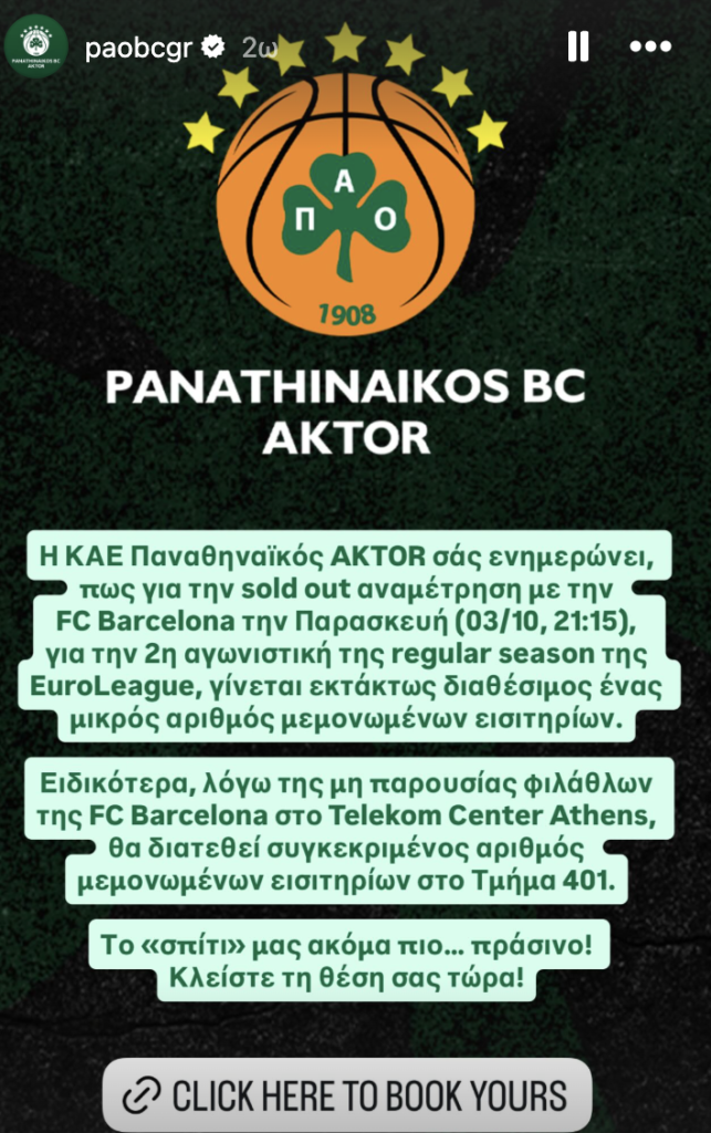 Συγκεκριμένα, λόγω της μη παρουσίας φιλάθλων της Μπαρτσελόνα στο Telekom Center Athens, θα διατεθούν περιορισμένα εισιτήρια στο Τμήμα 401, δίνοντας την ευκαιρία σε ακόμα περισσότερους οπαδούς να βρεθούν στο πλευρό του «Επτάστερου».