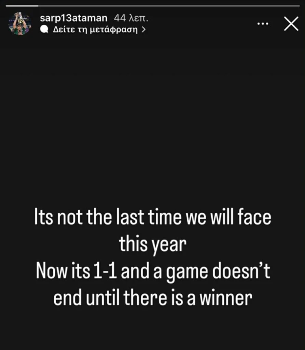 Μία ημέρα μετά το παιχνίδι, ο γιος του Εργκίν Αταμάν, Σαρπ, έστειλε το δικό του μήνυμα μέσα από τα social media, ξεκαθαρίζοντας πως η ιστορία των δύο ομάδων δεν έχει κλείσει. Όπως τόνισε, η «μάχη» παραμένει ανοιχτή, υπογραμμίζοντας πως η σεζόν έχει ακόμη δρόμο και ότι το 1-1 στις μεταξύ τους αναμετρήσεις δεν αποτελεί το τέλος της υπόθεσης.