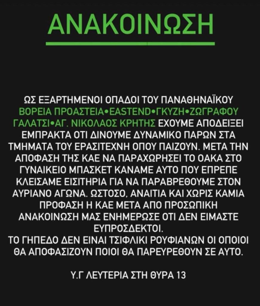 «Ως εξαρτημένοι οπαδοί του Παναθηναϊκού Βόρεια Προάστεια, East End, Γκύζη, Ζωγράφου, Γαλάτσι, Αγ. Νικόλαος Κρήτης έχουμε αποδείξει έμπρακτα ότι δίνουμε δυναμικό παρών στα τμήματα του Ερασιτέχνη όπου παίζουν. Μετά την απόφαση της ΚΑΕ να παραχωρήσει το ΟΑΚΑ στο γυναικείο μπάσκετ κάναμε αυτό που έπρεπε, κλείσαμε εισιτήρια για να παραβρεθούμε στον αυριανό αγώνα. Ωστόσο, αναίτια και χωρίς καμία πρόφαση η ΚΑΕ μετά από προσωπική ανακοίνωσή μας ενημέρωσε ότι δεν είμαστε ευπρόσδεκτοι. Το γήπεδο δεν είναι τσιφλίκι ρουφιάνων οι οποίοι θα αποφασίζουν ποιοι θα παρευρεθούν σε αυτό. Υ.Γ. Λευτεριά στη Θύρα 13».