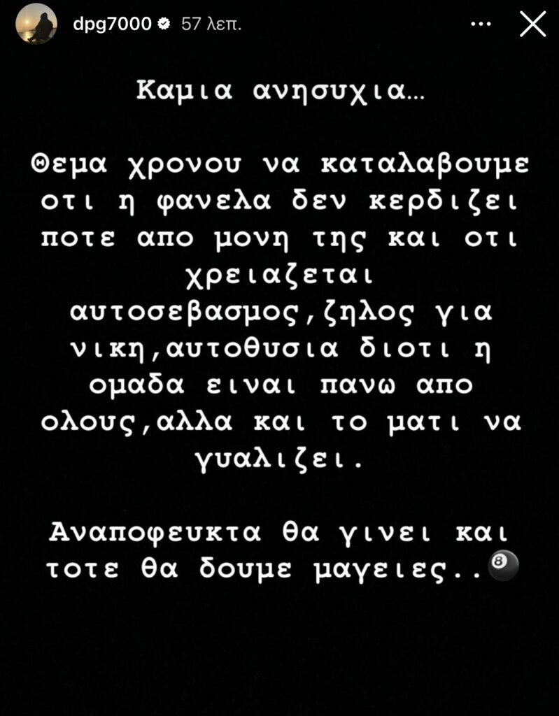 «Καμία ανησυχία… Θέμα χρόνου να καταλάβουμε ότι η φανέλα δεν κερδίζει ποτέ από μόνη της και ότι χρειάζεται αυτοσεβασμός, ζήλος για νίκη, αυτοθυσία διότι η ομάδα είναι πάνω από όλους, αλλά και το μάτι να γυαλίζει. Αναπόφευκτα θα γίνει και τότε θα δούμε μαγείες», έγραψε χαρακτηριστικά ο ισχυρός άνδρας του «Τριφυλλιού», δείχνοντας πίστη στη δουλειά και την πορεία του Εργκίν Αταμάν και των παικτών του.