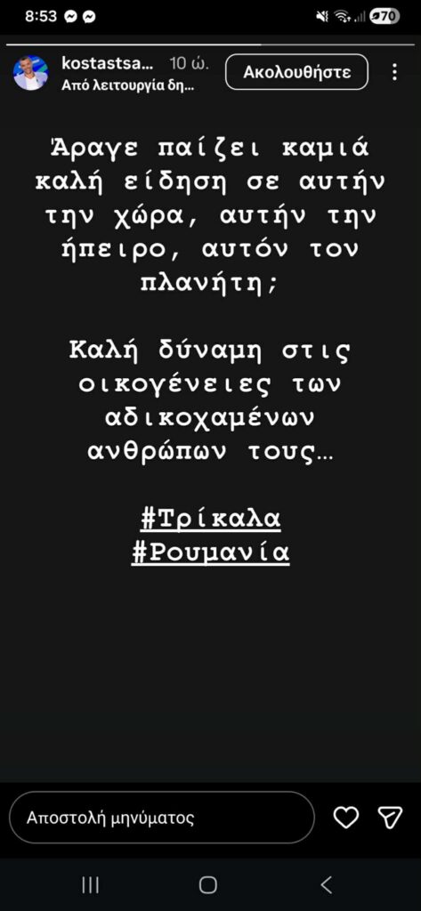 Ο παλαίμαχος καλαθοσφαιριστής του Παναθηναϊκού δεν έκρυψε τον πόνο και την απογοήτευσή του, αναρωτώμενος δημόσια αν υπάρχει κάποια θετική είδηση σε έναν κόσμο που δοκιμάζεται συνεχώς. Παράλληλα, ο Κώστας Τσαρτσαρής ευχήθηκε δύναμη και κουράγιο στις οικογένειες των αδικοχαμένων, κλείνοντας το μήνυμά του με λόγια συμπόνιας και σεβασμού.