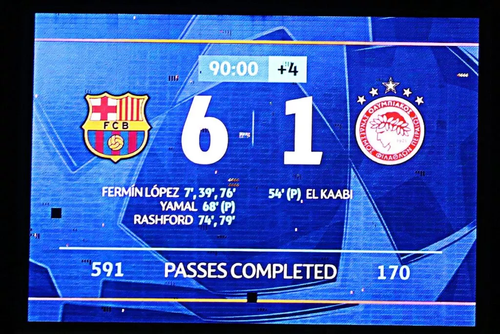 - 21/10/2025 – Champions League: Μπαρτσελόνα – Ολυμπιακός 6-1