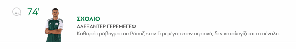 Αντίδραση από την ΠΑΕ Παναθηναϊκός για τη φάση του 74ου λεπτού στο παιχνίδι απέναντι στον Άρη, όταν ο Γερεμέγεφ βρέθηκε στο έδαφος μέσα στην περιοχή, ύστερα από ξεκάθαρο τράβηγμα του Ρόουζ. Παρά τη φανερή παράβαση, ο διαιτητής της αναμέτρησης δεν υπέδειξε την εσχάτη των ποινών, προκαλώντας τις διαμαρτυρίες των «πράσινων».