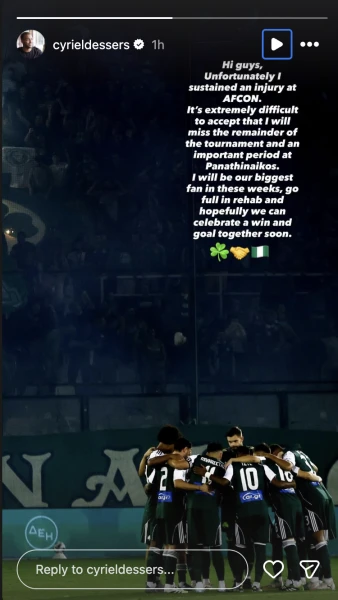 Ο Σίριλ Ντέσερς έστειλε το δικό του μήνυμα στους φιλάθλους του Παναθηναϊκού, λίγες ημέρες μετά τον τραυματισμό που υπέστη στο Κύπελλο Εθνών Αφρικής και που αναμένεται να τον κρατήσει εκτός αγωνιστικής δράσης για περίπου δυόμιση μήνες.